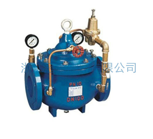 當閥門從進口端給水時,水流過針閥進入主閥控制室,出口壓力通過導(dǎo)管作用到導(dǎo)閥上。當出口壓力高于導(dǎo)閥彈簧設(shè)定值時,導(dǎo)閥關(guān)閉??刂剖彝V古潘藭r主閥控制室內(nèi)壓力升高并關(guān)閉主閥,出口壓力不再升高。當閥門出口壓力降到導(dǎo)閥彈簧設(shè)定壓力時,導(dǎo)閥開啟,控制室向下游排水。由于導(dǎo)閥系統(tǒng)排水量大于針閥的進水量,主閥控制室壓力下降。進口壓力使主閥開啟。在穩(wěn)定狀態(tài)下,控制室進水、排水相同,主閥開度不變,出口壓力穩(wěn)定。調(diào)節(jié)導(dǎo)閥彈簧即可設(shè)定出口壓力。
